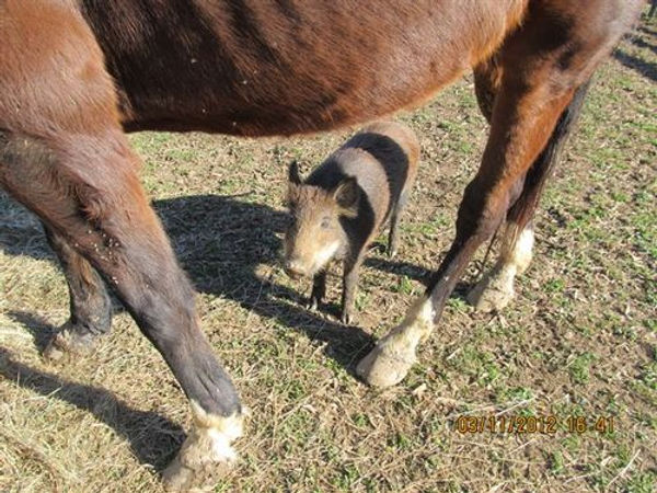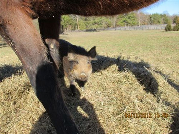 the answer is: my mom’s old, retired, curmudgeonly showhorse, herb, who loves nothing and no one in this WHOLE WORLD, found a wild piglet while he was turned out one day. and when my mother went to bring him back to the barn he looked at her and said with his sad horse eyes, “this is my pig. i found it. it’s good. it’s little, and ugly, but still good.”
